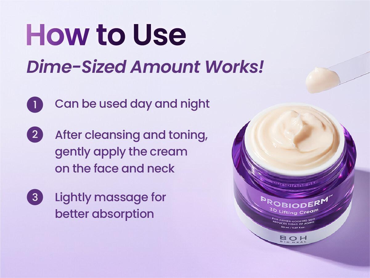How to UseFor your morning and nighttime skincare, apply the cream along skin texture and press gently with the palms of your hands to help with absorption.Individual allergic reactions may occur. Do not use this product if you are allergic to any of its ingredients. If irritation occurs, stop use immediately and consult a healthcare professional.